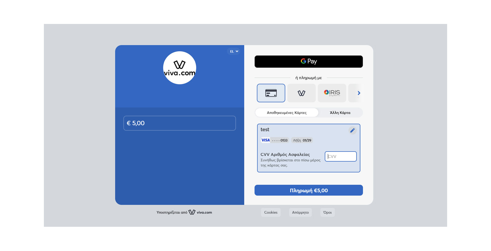 Πιστωτική / Χρεωστική Κάρτα, IRIS, E Banking, Google Pay, Apple Pay, VIVA, Klarna, Tbi